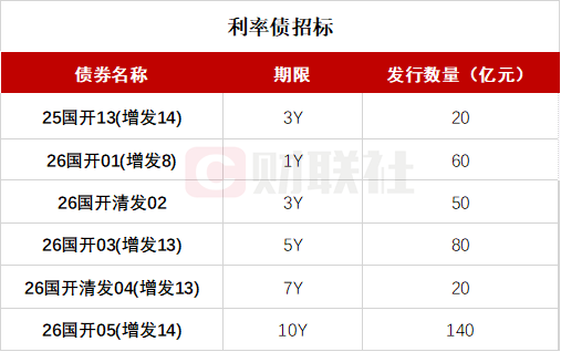 财联社4月23日电,按照此前公布的发行计划,国开行将于上午09:30-10:30和下午14:30-15:30招标发行六期金融债,分别为:2025年第十三期金融债券(第十四次增发),期限3年,发行量不超过20亿元,票面利率1.51%;2026年在上海清算所第四期金融债券(第十三次增发),期限7年,发行量不超过20亿元,票面利率1.94%;2026年第一期金融债券(第八次增发),期限1年,发行量不超过60亿元,票面利率1.51%;2026年第三期金融债券(第十三次增发),期限5年,发行量不超过80亿元,票面利率1.69%;2026年第五期金融债券(第十四次增发),期限10年,发行量不超过140亿元,票面利率1.92%;2026年在上海清算所第二期金融债券,期限3年,发行量不超过50亿元。