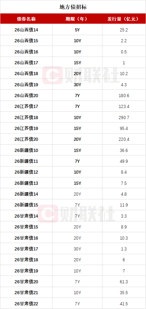 【今日将发行四批次地方债,包括山西、江苏、新疆、甘肃】