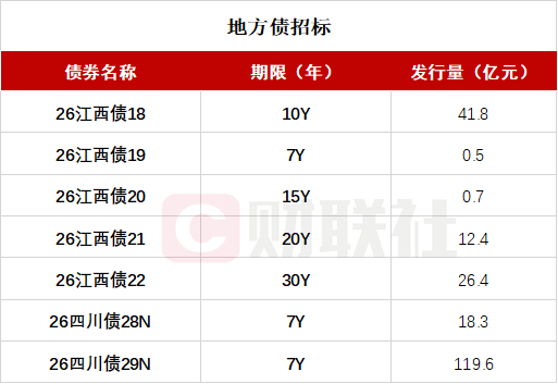 财联社4月24日电,今日将发行两批次地方债,包括江西、四川,具体如下: