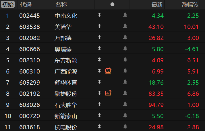财联社3月30日电,市场焦点股中南文化(15天8板)低开2.25%,医药板块美诺华(11天6板)高开10.01%、万邦德(4天3板)高开3.00%,算力租赁概念股奥瑞德(8天5板)低开4.61%,电力板块东方新能(10天5板)高开6.51%、广西能源(6天3板)高开5.91%,体育产业链的舒华体育(10天5板)低开2.55%,锂电池板块融捷股份(4板)高开6.86%、石大胜华(6天3板)高开1.00%,电网设备板块新能泰山(4板)低开0.18%、杭电股份(3天2板)高开2.88%。