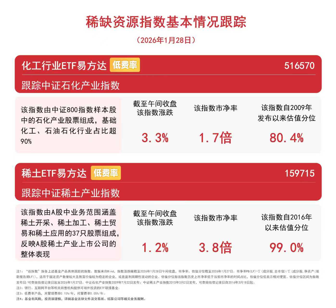 中证石化产业指数覆盖“三桶油”、万华化学、恒力石化等石油石化、基础化工产业龙头,其PX-PTA-长丝产业链含量高,直接受益于产品涨价预期与行业估值修复。化工行业ETF易方达(516570)管理费率仅为0.15%/年,处于全市场ETF中最低一档,为投资者布局行业供需共振机遇提供了低成本工具。
